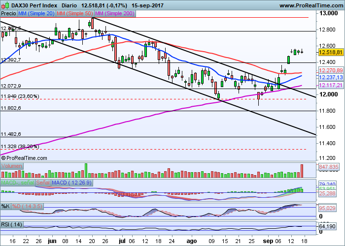 En la actualidad, y ya desde hace algunas sesiones, la tendencia de corto plazo ha variado desde bajista a neutral-alcista y los objetivos que se pueden plantear para el principal índice alemán son los 12.800 enteros donde encontramos su resistencia intermedia.