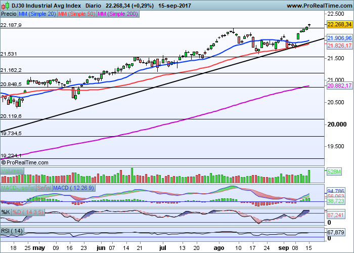 En la sesión del pasado viernes, el Dow Jones desplegó una interesante vela blanca con ruptura por encima de su última resistencia que se situaba en niveles de 22.190 enteros y que podría dar paso a un nuevo movimiento alcista tendente a buscar los 22.800 puntos, que es la extensión del último lateral de este índice.