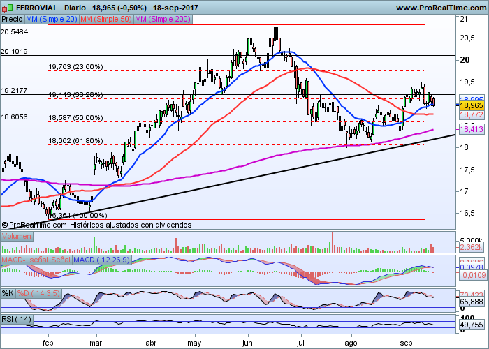 Por técnico, el valor nos ofrece una estructura interesante con apoyo en la directriz alcista o zona de soporte creciente que está sirviendo para que se vayan alcanzando nuevos niveles. El último apoyo se efectuó durante el transcurso del mes de agosto y la zona no fue otra que la MM200 (media móvil de 200 sesiones) desde donde se ha tratado de reaccionar al alza. Dicha reacción ha llevado a Ferrovial a alcanzar la zona de los 19.50 euros y estancándose en su resistencia de los 19.10 euros.