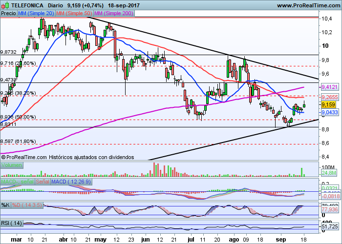 De todos es bien sabido que el Ibex-35 no consigue superar la zona de los 10.600 puntos, que es la parte alta del canal bajista que viene desplegando en el momento actual, y que daría paso a un cambio de tendencia. En cualquier caso, y visto el retroceso que ha experimentado la teleco que nos ocupa en estos momentos, y visto que trata de rebotar desde una zona de soporte proporcional Fibonacci (50%) a todo el gran recorrido alcista previo que se inició el pasado mes de diciembre hasta mayo.