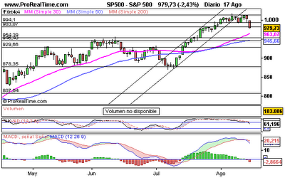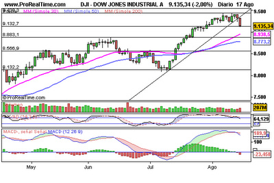 Dow Jones: Se apoyó ayer perfectamente en el canal que teniamos marcado dias atras. Rotura de la tendencia alcista marcada desde la primera mitad del mes de Julio, y , aunque apoyado bien en el soporte de los 9132 puntos, hoy podria romperlo, a la vista de los demás índices, en especial el SP500 que sí rompió. Si esto se produce, podriamos ver a un dow jones en los 8880 puntos en primera instancia y de ahí veríamos qué ocurre.
