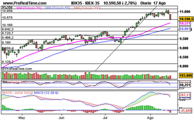 Ibex-35: Gráfico muy parecido al Dow Jones, solamente que bastante tiempo antes se metió en lateralidad, ha aguantado la línea de soporte que os marqué dias atras, al igual que el Dow Jones. El soporte de los 10600 puntos es vital, puesto que de perderlos podríamos ver a nuestro índice en los 10168 enteros, de momento a estas horas lo está aguantando por los pelos, de seguir así deberiamos esperar a ver cómo abren los americanos y actuar en consecuencia. Aumento de volumen en el dia de ayer, ante las abultadas caídas que pudimos ver, lo que afianza la misma. Yo creo que hoy o tal vez mañana, podriamos seguir la corrección que vimos ayer, el Estocástico marca venta y el Macd se cruzó ayer a la baja. Lo único que podria aguantar un poco el envite del mercado serian las medias que todavia no se cruzaron.