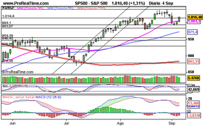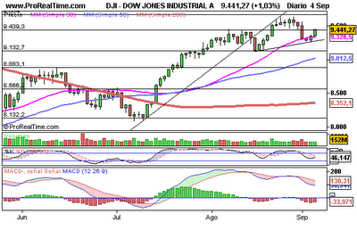 Dow Jones de industriales: Situado en zona de resistencia, donde ya hay triple techo formado en la zona de los 9.440 puntos. Podriamos estar ante un nuevo tramo al alza en cuanto rompa esta resistencia y llevarnos en primera instancia hacia los 9.675 enteros. El mal dato de paro del viernes se interpretó positivamente, no hay ganas de caer. El mercado aún tiene fuerza. Almenos eso parece.
