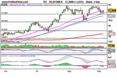 Bien, vamos a ver si nos metemos en Telefónica antes del dia 9 de Octubre, y podemos aprovecharnos de este esperado impulso alcista. Tiene una reistencia importante en los 17.84 pero si la supera podria irse bastante más arriba. Es una de las que se quedó algo rezagada del rally que todos hemos visto.