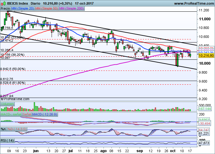 El selectivo de la bolsa española recupera los 10.200 puntos pero sigue inmerso dentro del canal bajista que ha dibujado desde principios del pasado mes de Mayo y que no deja elevar el precio de la cotización de sus activos.