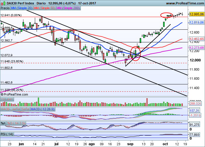 En cuanto al Dax alemán, el índice ha revertido claramente su tendencia de bajista a alcista y sigue protagonizando alzas sostenidas que arrancaron con el alcance y consolidación del soporte importante situado en los 12.000 enteros que ha dado pie a una gran revalorización de cerca de 1.000 puntos hasta alcanzar la cota clave y psicológica como son los 13.000 puntos.