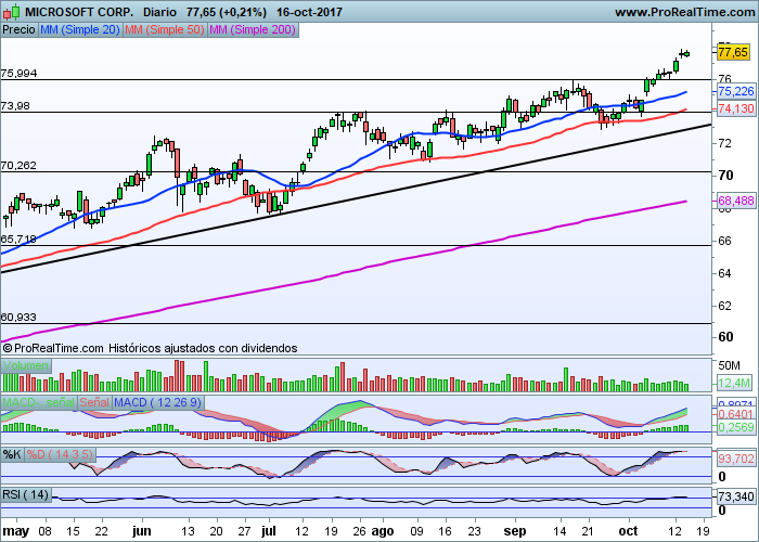 Uno de estos valores es Microsoft (Nasdaq), y que mantiene una secuencia alcista muy importante desde los mínimos alcanzados en julio del año pasado. Secuencia de máximos y mínimos relativos crecientes y perfectamente canalizada que otorga al valor un potencial alcista interesante desde el punto de vista técnico. Superada su última resistencia en la zona de los 76 dólares, podríamos otorgarle un nivel objetivo cercano a los 80 dólares por acción.