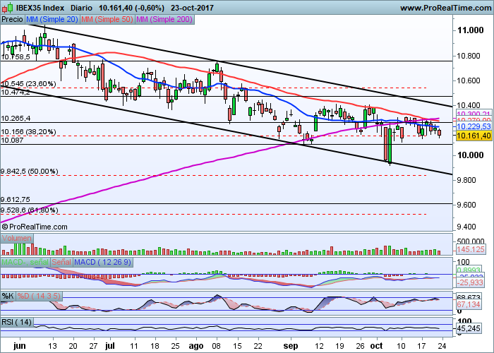 Para que esta situación pueda revertirse, es necesario que superemos en estos momentos la zona de los 10.400 puntos que es por donde pasar la directriz o parte alta de dicho canal y que es necesaria su superación para dar por finalizada la tendencia bajista, o cuanto menos para que ésta pueda comenzar a anularse.