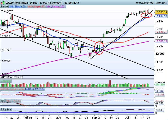El principal índice alemán, el Dax, sigue enfrentándose a la zona de los 13.000 enteros, un nivel que comienza a funcionar como resistencia importante a batir además de contribuir a ser un nivel psicológico importante.