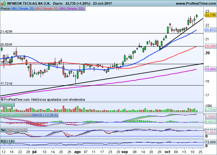 En este sentido encontramos valores como Infineon, donde las previsiones de que en próximos trimestres siga presentando buenas cuentas, además de tener un Per adecuado para cualquier valor de su sector, además de un gráfico técnico muy interesante, hace de él una oportunidad clarísima de inversión.