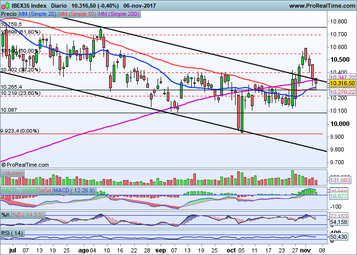 Mientras el resto de plazas han estado subiendo y marcando nuevos máximos, nuestro Ibex ha permanecido en la inopia, abducido por los acontecimientos en Cataluña y atemorizando a inversores que no hacían más que huir de nuestra renta variable. En cuanto el problema catalán se ha relajado el Ibex ha intentado una remontada de última hora, consiguiéndolo pero viniéndose abajo en cuanto lo hacen el resto de plazas. Así es imposible seguir subiendo. Hoy se consigue pero mañana se cae más de lo conseguido y así es imposible obtener rentabilidad en el mercado español.