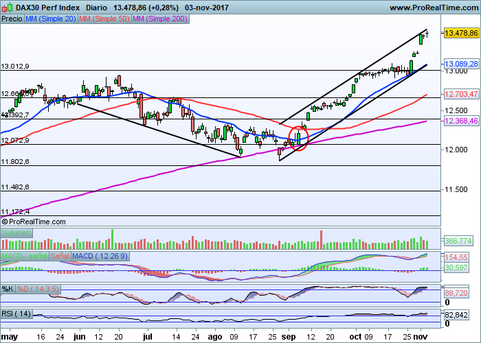 En una semana carente de datos macroeconómicos importantes, el Dax parece que quiere tomarse un respiro. La zona de los 13.500 puntos parece ser el nivel donde detener las alzas de muy corto plazo.