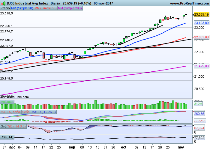 Por su parte, el Dow Jones de industriales, sigue formando máximo tras máximo. El pasado viernes volvió a superar una de sus resistencias de corto plazo más representativas como eran los 23.520 puntos, dibujando una vela potencialmente alcista.