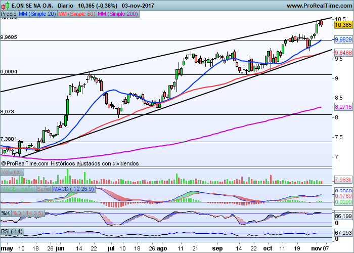 Si observamos el gráfico adjunto, no tardaremos en darnos cuenta que el valor viene marcando una secuencia de máximos y mínimos relativos crecientes en gráfico diario, una pauta alcista que inició en el primer trimestre del ejercicio cuando cotizaba en la zona de los 7 euros e inmediaciones hasta cerca de los 10.50 euros que cotiza ahora mismo.