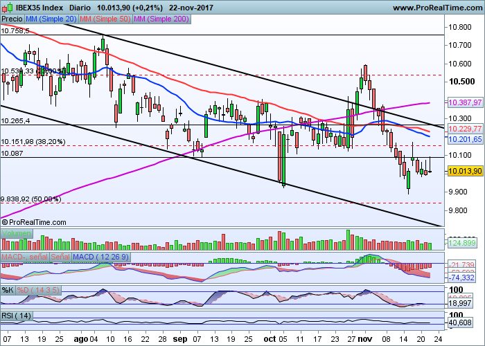 La inercia bajista sigue intacta en el momento actual y el canal, también bajista, está vigente. Lo único diferente es que la última pata bajista no se ha realizado por debajo de los mínimos previos , es decir, que la zona de los 9.800 puntos ha funcionado como soporte de corto plazo para no seguir perdiendo más fuelle.