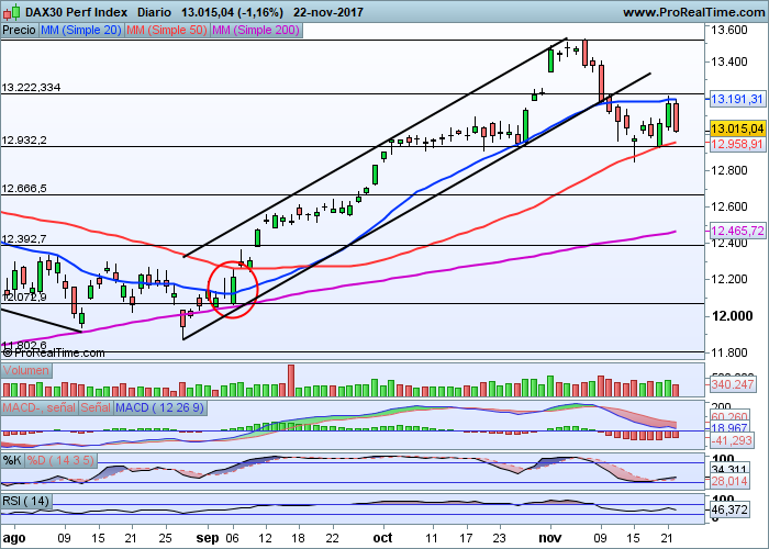 La fuerte volatilidad que se comienza a ver en intradía comienza a provocar descensos en este índice y a desestabilizar las alzas que había conseguido en los últimos dos meses. La zona de soporte en los 13.000 enteros pues, se convierte en un nivel determinante a la hora de tomar decisiones sobre el Dax alemán.