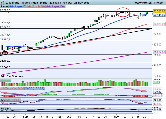 Superados los 23.600, iniciaríamos un nuevo proceso alcista, aunque tendremos que esperar hasta la semana próxima para verlo claramente, ya que el viernes se espera muy poco volumen en Wall Street por el motivo que apuntábamos antes.
