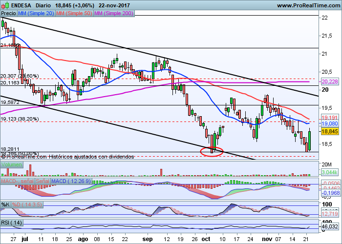 Con esta figura de vuelta que hemos visto en la sesión de hoy se configura un reversal importante para sus títulos que rebotan desde un soporte fiable como son los 18.15 euros y que es además el 60% de Fibonacci al último gran movimiento alcista previo. Pese a mantener una secuencia de máximos y mínimos relativos decrecientes, una secuencia nefasta para la renta variable, la vela de hoy (envolvente alcista) podría presagiar la vuelta a niveles de resistencia decrecientes en la zona 19.80 euros.