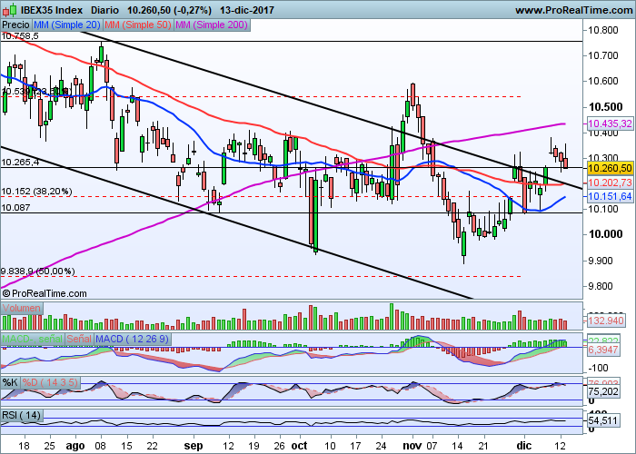Es necesario pues, que se superen los máximos vistos en los 3 últimos dias, esto es, que se superen los 10.380 puntos para determinar que lo visto ha sido una ruptura de canal con posterior consolidación y cierre de hueco y no un escape alcista fallido.