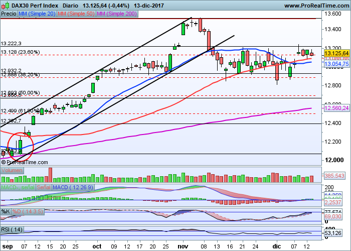 Pocos cambios analíticos importantes desde el punto de vista técnico para el Dax alemán, que se mueve en un rango lateral que comprende los 12.930 puntos por abajo y los 13.200 en la parte más alta desde hace prácticamente un mes.