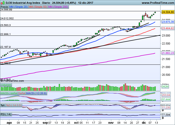 Con la ruputra al alza del nivel de los 24.500 puntos, donde incluso se podría haber antojado una figura de doble techo, queda despejado el camino hacia niveles de 25.000 puntos donde encontramos su siguiente resistencia.