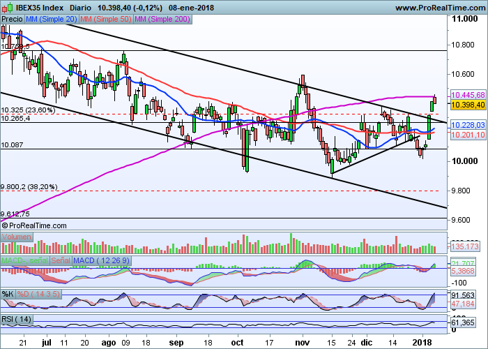 La Bolsa española ha cerrado cada una de las jornadas de 2018 con subidas. El optimismo con el que ha arrancado el nuevo ejercicio ha permitido impulsar al Ibex por encima de los 10.400 puntos. El índice selectivo español ha comenzado la semana con las referencias alcistas de Asia y con las expectativas de un acuerdo para sellar una gran coalición de Gobierno en Alemania. El Ibex allana el camino para consolidar todo lo ganado en las cuatro sesiones anteriores.
