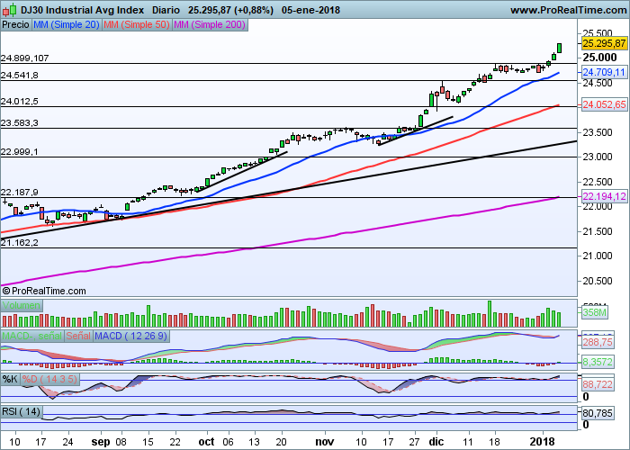 El Dow Jones de Industriales, al igual que el resto de índices americanos se encuentran en subida libre técnica y absoluta desde hace cierto tiempo. Donde parecía que los 25.000 puntos pudieran detener el avance de los índices americanos, nada más lejos de la realidad, cuando su superación ha terminado por dar más alas y el índice que nos atañe en estos momentos ya ha alcanzado la zona de los 25.300 puntos que probablemente supere en próximos dias.