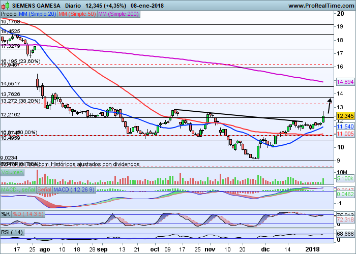 Nos reiteramos en que el valor mantiene cierto atractivo en el corto y medio plazo colándose entre los más rentables en los primeros compases de este 2.018. Cualquier posición que se tome no debería permitirse caídas más allá de los 12.20 euros y se establecería un objetivo principal en los 13.90 euros en primera isntancia y la zona de los 15 euros en un segundo empuje alcista.