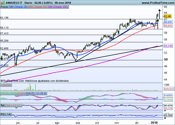 En el caso de Amadeus, y vistas las dos potentes velas alcistas desplegadas en las dos sesiones anteriores, observamos la ruptura del nivel de los 62 euros que constituía una resistencia importante de corto y medio plazo para el valor, resistencia que ha tratado de perforar ya en algunas ocasiones sin éxito.