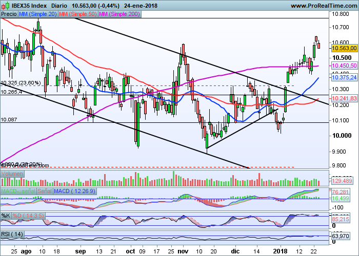 Hay que tener mucho cuidado porque la vela roja que desplegó en la sesión de ayer el Ibex se antoja más a una posible formación de estrella de la noche que otra cosa. Para que la corrección no comience a tomar forma, es vital que se permanezca en todo momento por encima del 50% de la vela blanca de ayer, es decir, por encima de 10.540 puntos ya que su pérdida implicaría mayores correcciones.