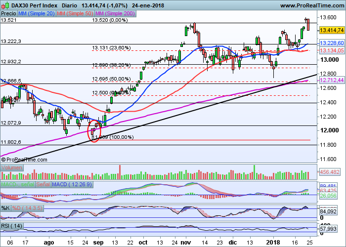 En cuanto al Dax alemán, vuelve a empeorar su aspecto técnico de corto plazo. En la sesión de ayer este índice rompía al alza su zona de resistencia más relevante como son los 13.520 puntos, aunque no con decisión y fuerza suficientes, algo que ha venido a ser corroborado en el día de hoy con una caída del 1.07% al cierre en mínimos intradiarios que invitan a pensar que mañana las correcciones podrían continuar.