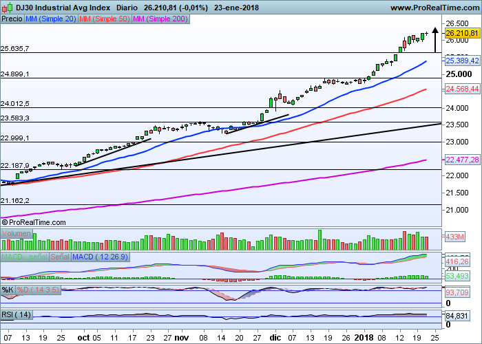Ciñéndonos a valoraciones técnicas, observamos cómo la proyección del último lateral nos coloca una resistencia en niveles de 26.500 puntos que podría detener el avance del DJI.