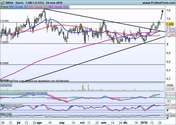 Por todo ello, destacamos el comportamiento de Bbva que trata de superar niveles de resistencia intermedios como son los 7.50 euros por acción lo que daría paso a un fuerte movimiento de rebote mínimo a buscar su siguiente zona relevante en los 7.85 euros. En la jornada de ayer ya se intentó sin éxito incluso dejando una pequeña cola en la parte de arriba, por lo que mañnaa y en dias sucesivos pensamos volverá a intentarlo.