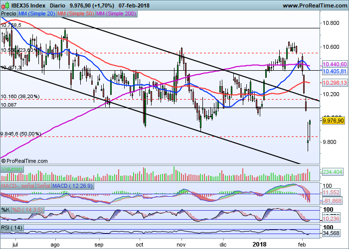 Los focos continúan centrados en Wall Street. La sesión de ayer no sólo cortó el varapalo. Sirvió para recuperar cerca de la mitad de lo perdido al inicio de la semana con avances superiores al 2% en el Dow Jones. En la sesión de hoy, tras las dudas iniciales, se consolida el rebote, que tiene su traslado a este lado del Atlántico.