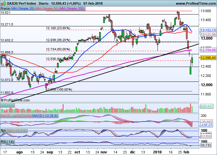 Las Bolsas europeas han abierto replicando el signo alcista con el que cerró ayer Wall Street e incrementan las subidas tras la apertura de la Bolsa de Nueva York. El índice Stoxx60 pone fin a una racha de siete caídas consecutivas y el Dax alemán recupera los 12.500 puntos, aunque aún muy lejos del máximo histórico alcanzado el pasado 23 de enero.