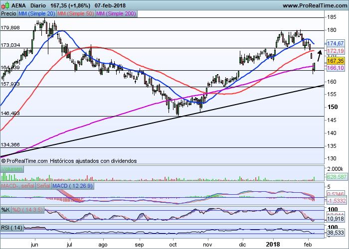 Teniendo en cuenta la caída que hemso visto en los mercados en los últimos dias y su posterior intento de rebote en la sesión de hoy, uno de los valores que podría efectuar una seria recuperación es Aena, ya que en ningún caso ha perdido niveles de soporte importantes ni la directriz alcista de medio plazo que ha sostenido la tendencia alcista en los últimos meses.