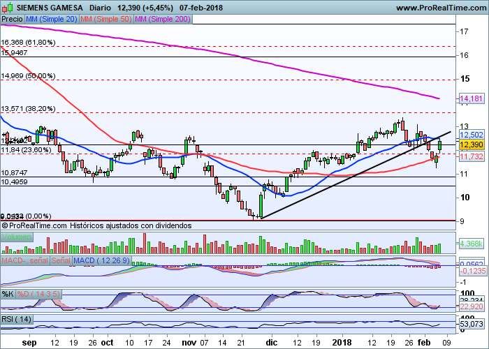 Rebote importantísimo del valor que ya marcaba maneras a primera hora buscando un rebote importante, lo único que la zona desde la que lo ha hecho no representa ningún nivel de soporte clave, eso sí, se busca recuperar la directriz alcista acelerada de corto plazo que devolvería la inercia alcista y las posibilidades de que se sigan alcanzando cotas superiores como son los 15 euros por acción que es donde tiene su siguiente objetivo.