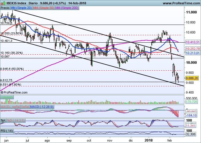 En cuanto al selectivo de la bolsa española, nuestro Ibex sigue inmerso dentro del canal bajista de corto y medio plazo que ha propiciado una consecución de máximos y mínimos relativos decrecientes en gráfico diario y se sitúa en la parte baja del mismo, cerca de los 9.600 puntos que son también soporte proporcional Fibonacci 61.80% a todo el gran proceso alcista que se inició en los 8.500 puntos.