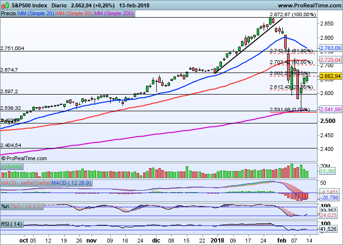 En los índices estadounidenses el comportamiento prácticamente es el mismo en todos los casos, y es que después de la enorme caída que llevó, en el caso del SP500 desde la zona 2.870 (máximos interanuales) a 2.500 puntos prácticamente en 7-8 sesiones, observamos cierto rebote cortoplacista tendente a buscar el nivel de retrocesión proporcional Fibonacci 38.20% tal como se puede apreciar en le gráfico adjunto, y desde ahí viene un punto clave en el desarrollo de la tendencia puesto que los mercados podrían tener ya suficiente para seguir cayendo o por el contrario seguir construyendo el actual rebote.