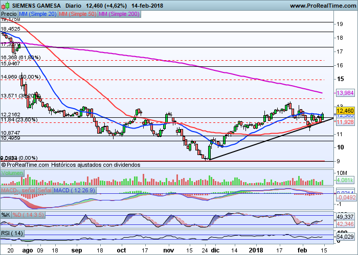 Técnicamente, los títulos de Siemens-Gamesa siguen en formación de rebote tendencial con formación de mínimos relativos crecientes en diario siguiendo con un patrón de recuperación propio de valores muy castigados. Podemos trazar una directriz alcista de corto plazo (directriz que podéis ver en el gráfico adjunto) que mantiene los precios al alza y que es respetada perfectamente y que ha aprovechado muy bien para apoyar en ella y seguir subiendo.