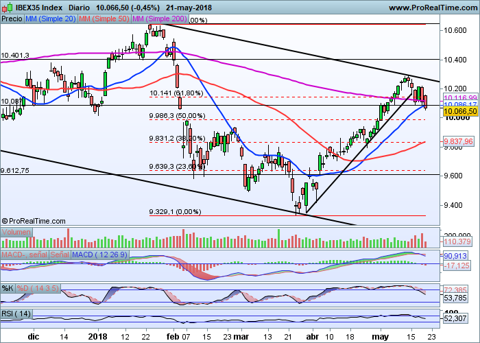 El selectivo de la bolsa española nada en aguas de la indefinición, y en una lateralidad muy bien definida y fuertemente ceñida entre los 10.080 como zona de principal soporte de corto plazo y los 10.250 puntos que es exactamente por donde pasa su resistencia decreciente de medio plazo.