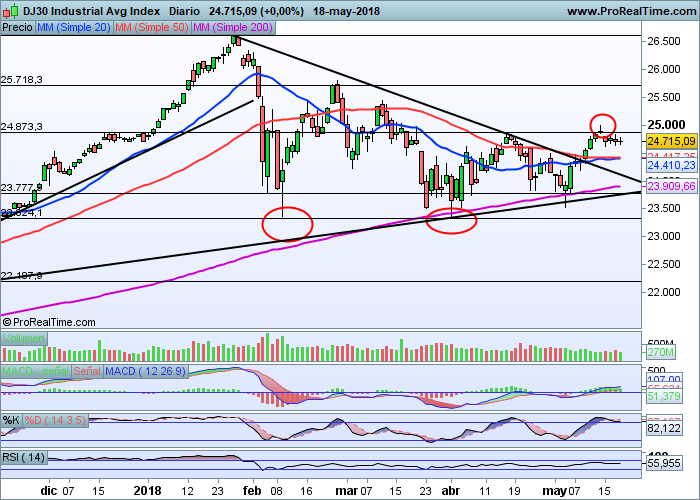 Tras cinco jornadas consecutivas de consolidación en las inmediaciones de esos 25.000 puntos, ha salido al alza y atacado su primera resitencia importante superándola sin ningún tipo de problema. Con ello se abre un proceso alcista tendente a buscar los 25.700 puntos como primer objetivo cortoplacista.