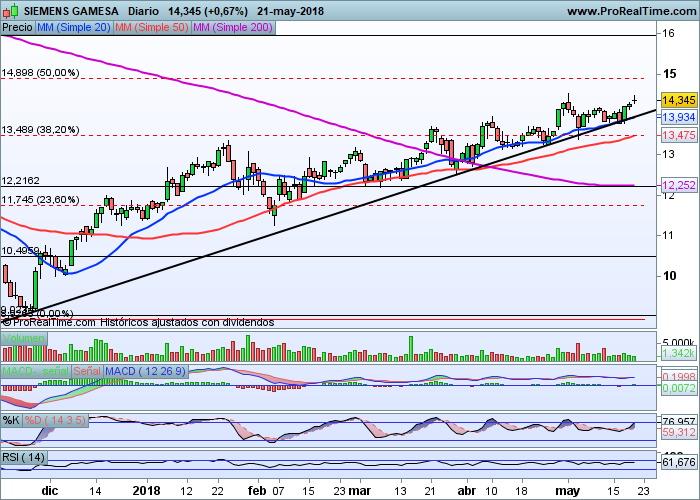 Si hay un valor que no está manipulado ni sujeto a variaciones de una materia prima como es el caso de Repsol y que se encuentre en pleno desarrollo de tendencia, encontramos a Siemens-Gamesa, que técnicamente sigue marcando una clarísima secuencia de máximos y mínimos relativos crecientes en gráfico diario regido por una directriz alcista que apoya el precio en todo momento y que no se ha puesto en duda durante los últimos meses, prácticamente desde finales del ejercicio pasado hasta el momento actual.