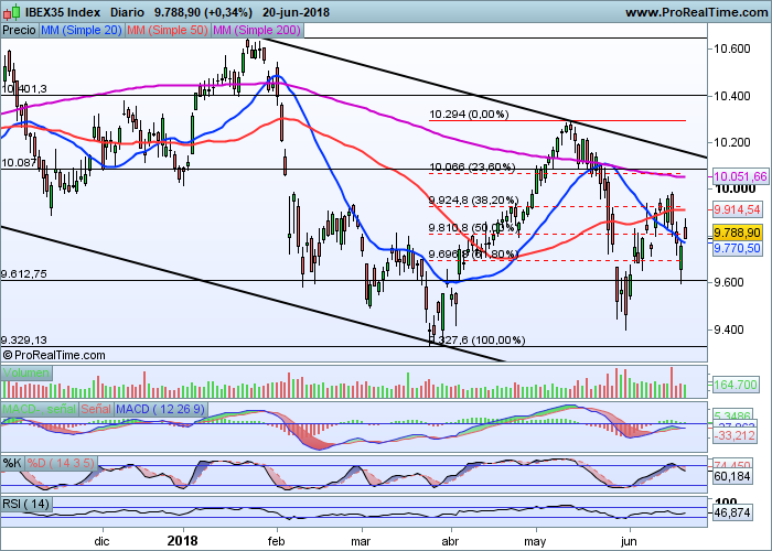 Técnicamente, sigue metido dentro de una tendencia bajista perfectamente dirigido por un amplio canal en este sentido que provoca un movimiento de máximos y mínimos relativos decrecientes en gráfico diario y semanal donde solamente podemos fijarnos en soportes y resistencias. En este sentido, ayer ya trató de apoyar en el soporte intermedio que representan los 9.600 enteros y consiguió cerrar por encima para hoy tender a buscar un rebote más o menos contundente que nos lleve a buscar la zona de los 10.100 puntos que es por donde pasa su resistendia decreciente (parte alta del canal en el que viene moviéndose el índice), que además es tangencial con su resistencia horizontal que pasa por el mismo punto.