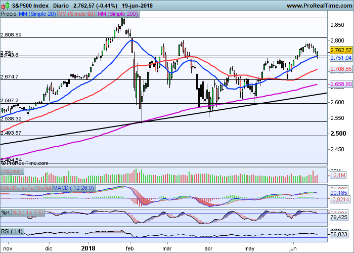 Wall Street sigue sin despertar y mucho menos alcanzar sus máximos anteriores, toda vez que los inversores temen que una guerra comercial entre los EEUU y China tenga su influencia negativa en los mercados de renta variable. En cuanto al SP500, este índice se mantiene prácticamente invariable, ya que a la sucesión de alzas, le siguen nuevas caídas, aunque todo ello haya derivado en una pequeña estructura de máximos y mínimos crecientes en diario desde zona de soporte creciente hasta alcanzar los 2.800 puntos.