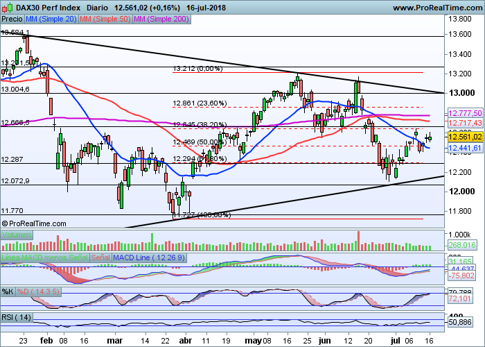 En cuanto al Dax alemán, pocos cambios analíticos desde el punto de vista técnico para un índice que se mantiene dentro de un lateral muy claro y que comprende desde aproximadamente los 12.000 puntos por abajo y los 13.200 puntos por arriba. Poco más de un 10% entre máximo y mínimo aunque siempre dentro de una figura de banderín que nos está dejando, encontrándonos bastante lejos de su vértice en estos momentos.