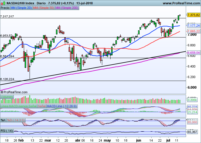 Superación de la zona de los 7.315 enteros que ha llevado al Nasdaq 100 a superar su zona de máximos y entrar técnicamente en subida libre absoluta, pese al alto nivel de sobrecompra existente en el mercado actualmente.