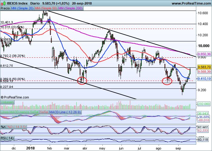 Con zona de soporte en 9.200 donde se ha producido una clarísima figura de vuelta, el selectivo español trata de buscar los 9.600 como zona de resistencia intermedia a batir desde la cual afrontar el segundo tramo hasta 9.800 donde encontramos el techo del canal y resistencia más importante a batir.