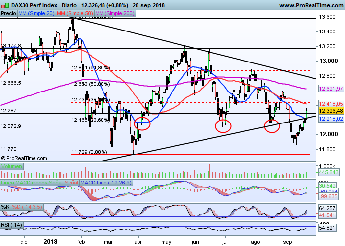 La situación técnica de este índice ha mejorado sensiblemente, por lo que, y si mañana viernes se cierra por encima de esos 12.165 enteros (cierre semanal), colocaríamos la mirada en los 12.775 puntos que es por donde pasa la bajista o resistencia decreciente. Es su siguiente objetivo cortoplacista pues.