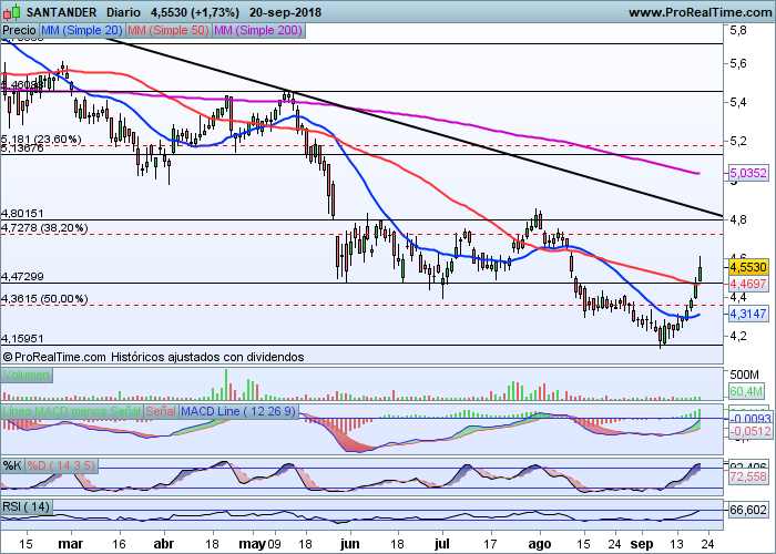El valor ha superado hoy su primera resistencia de corto y medio plazo, que era su anterior soporte dando forma a una figura de vuelta que debería llevar al valor a alcanzar niveles de 4.80 euros donde encontraremos su resistencia decreciente y nivel cuya superación daría paso a un cambio de tendencia principal de bajista a neutral.